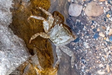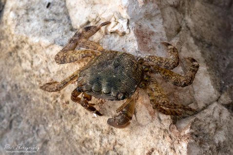 The Marbled Rock Crab (Pachygrapsus marmoratus) is a species of crab which lives in the Black Sea, the Mediterranean Sea and parts of the Atlantic Ocean. It is dark violet brown, with yellow marbling, and with a body up to 36mm long. The crab feeds on algae and various animals including mussels and limpets.